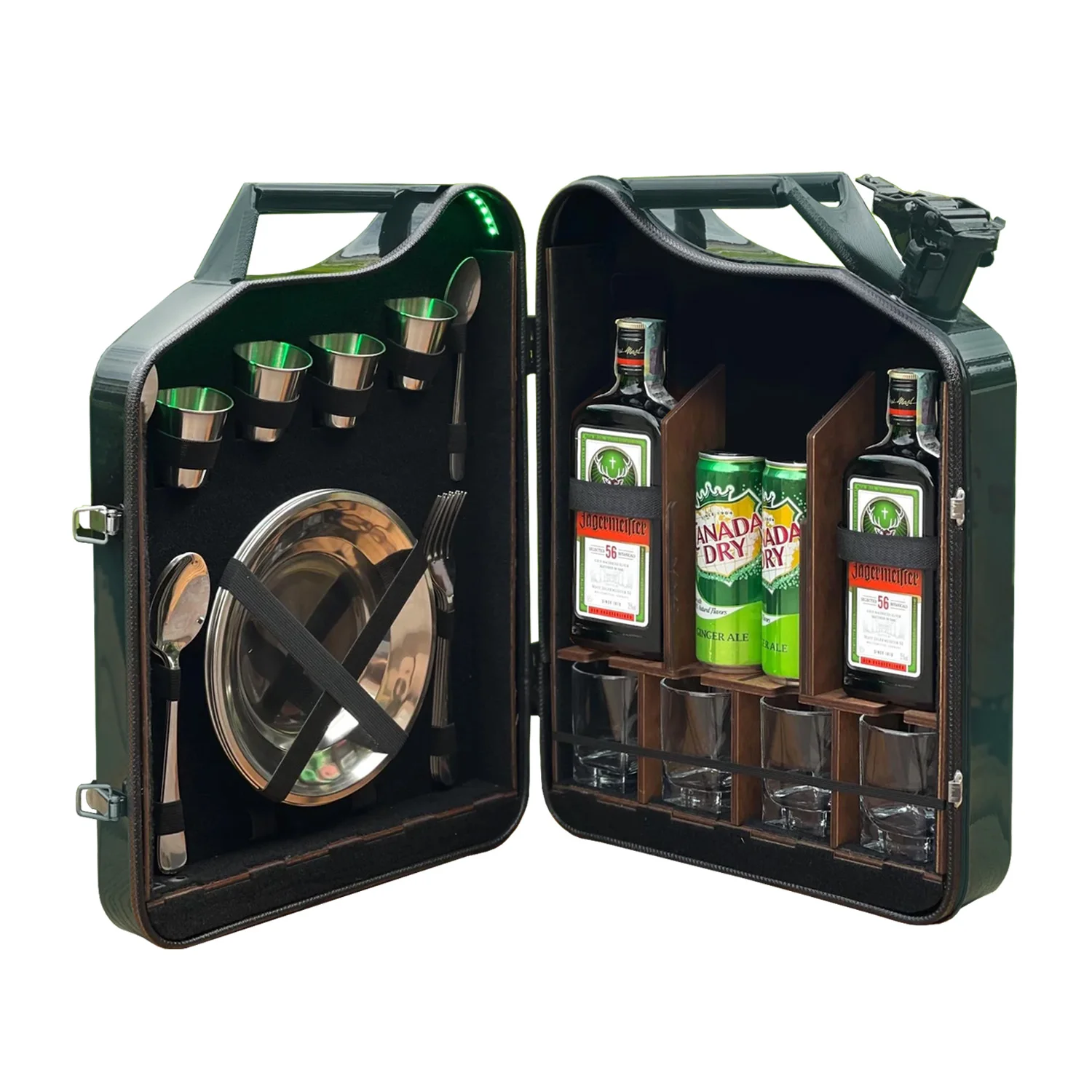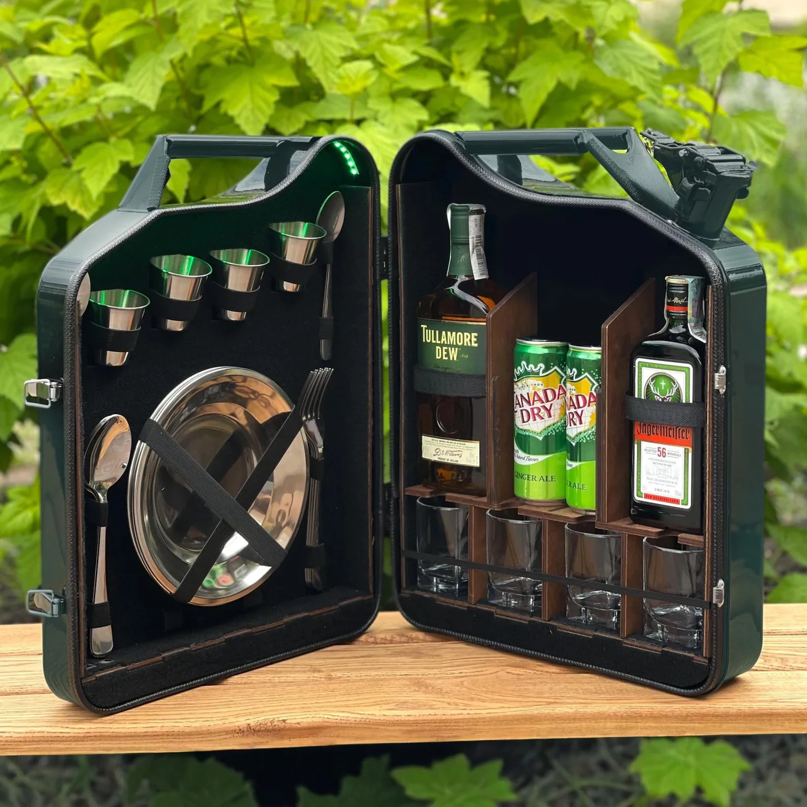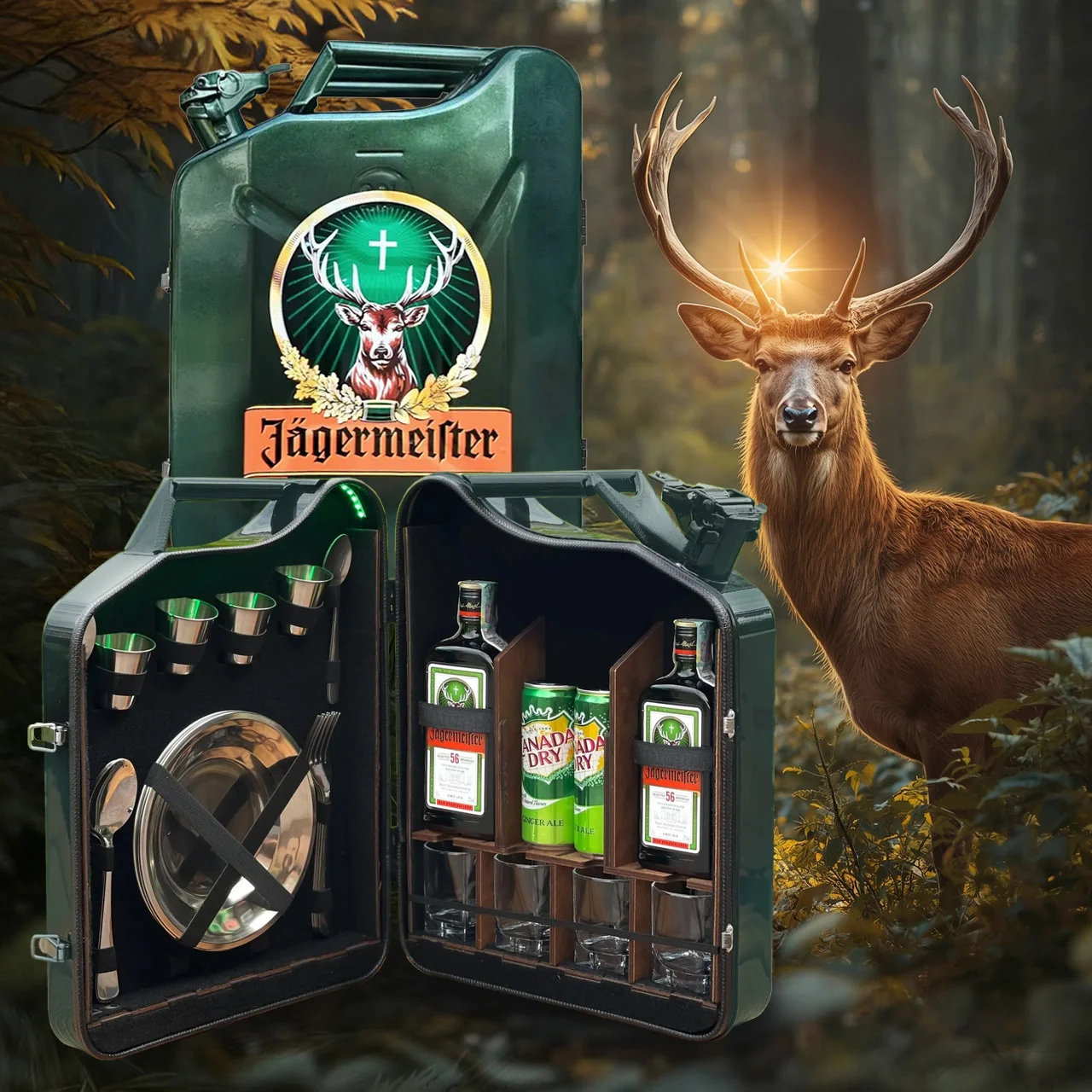 Die Kanisterbar 20 L Grün im „Jägermeister“- Design ist eine aussergewöhnliche Minibar aus einem echten Metallkanister, die Funktionalität, Stil und Originalität perfekt kombiniert. Diese kreative Bar im Kanister ist ideal für alle, die ihre Lieblingsgetränke auf eine besondere Weise präsentieren möchten.