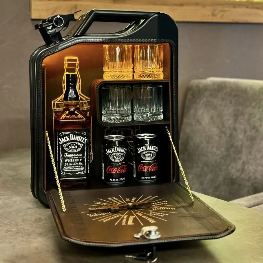Das innere der Kanister Mini Bar ist mit Stoff und Holz ausgekleidet, damit die Flasche und Gläser geschützt sind.