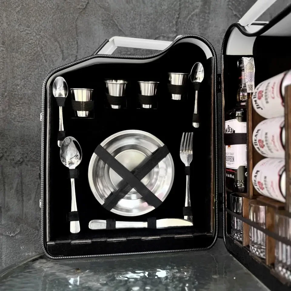 Unsere Mini Bar besteht aus einem 20 Literkanister und umfasst einen Satz Metallgeschirr für 4 Personen. 4 Metall Becher und 4 Gläser.